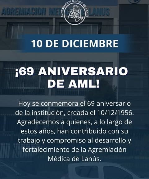 Hoy se conmemora el 69 aniversario de la institución, creada el 10/12/1956. Agradecemos a quienes, a lo largo de estos años, han contribuido con su trabajo y compromiso al desarrollo y fortalecimiento de la Agremiación Médica de Lanús.